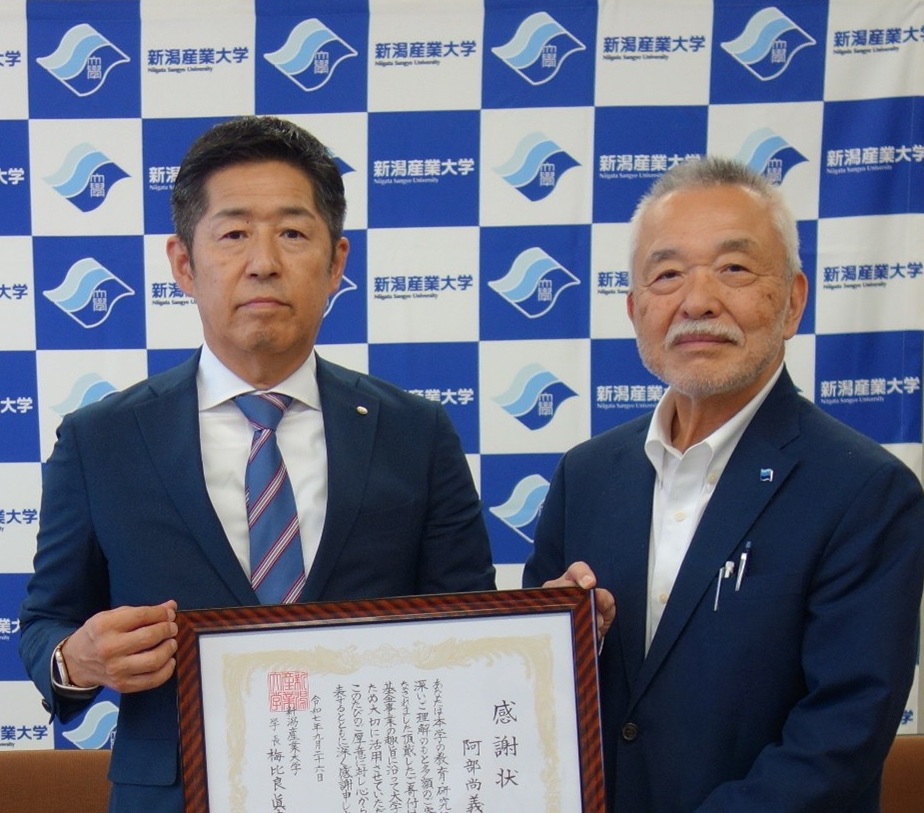 2025.09.29 ニュース 新潟産業大学基金高額寄付者への感謝状贈呈式が執り行われました 令和7年9月26日(金)、ご寄付を賜りました阿部尚義(あべ たかよし)様に対し、梅比良眞史学長が謝意を表明するとともに、感謝状を贈呈しました。 今回いただいたご寄付は、阿部様のご意向に沿い、本学の教育研究活動に有効に活用させていただきます。 今後とも新潟産業大学へのご理解とご協力をよろしくお願い申し上げます。 ご寄付いただいた阿部尚義様(左) 寄付申込フォーム 次のページ 【サッカー部】北信越大学サッカーリーグ後期5節の結果 前のページ 2025(令和7)年度秋季学納金納入のご案内