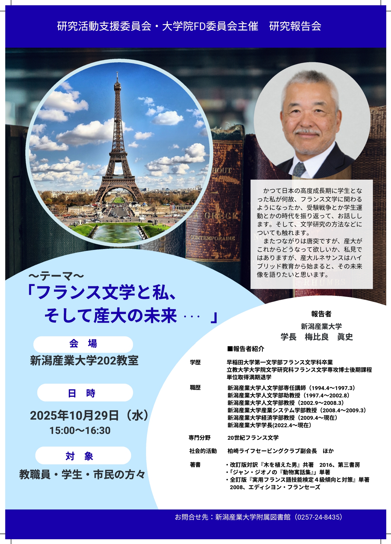 新潟産業大学では2025年10月29日(水)、梅比良眞史学長による、「フランス文学と私、そして産大の未来・・・」をテーマにした研究報告会が開催されます。
