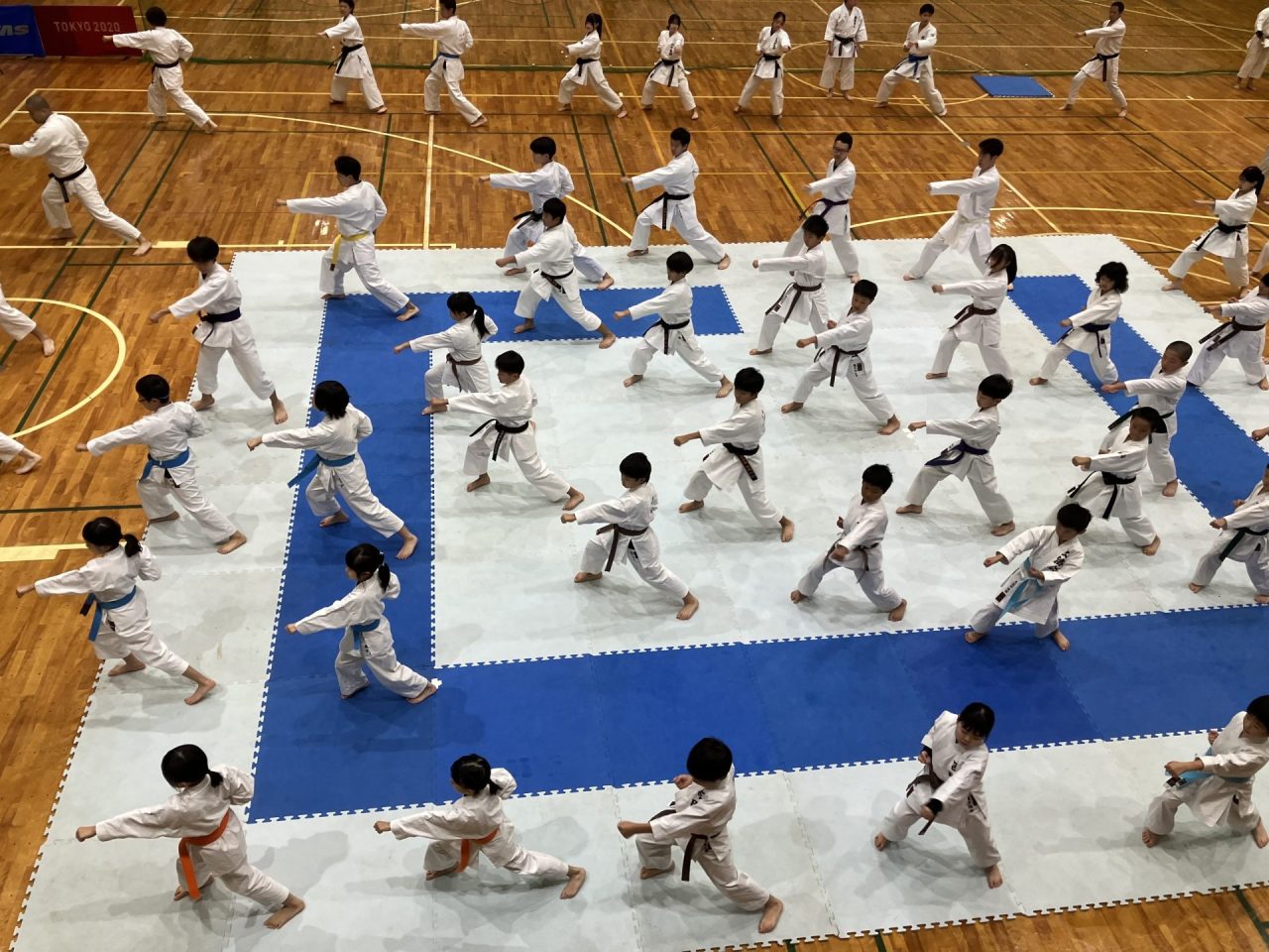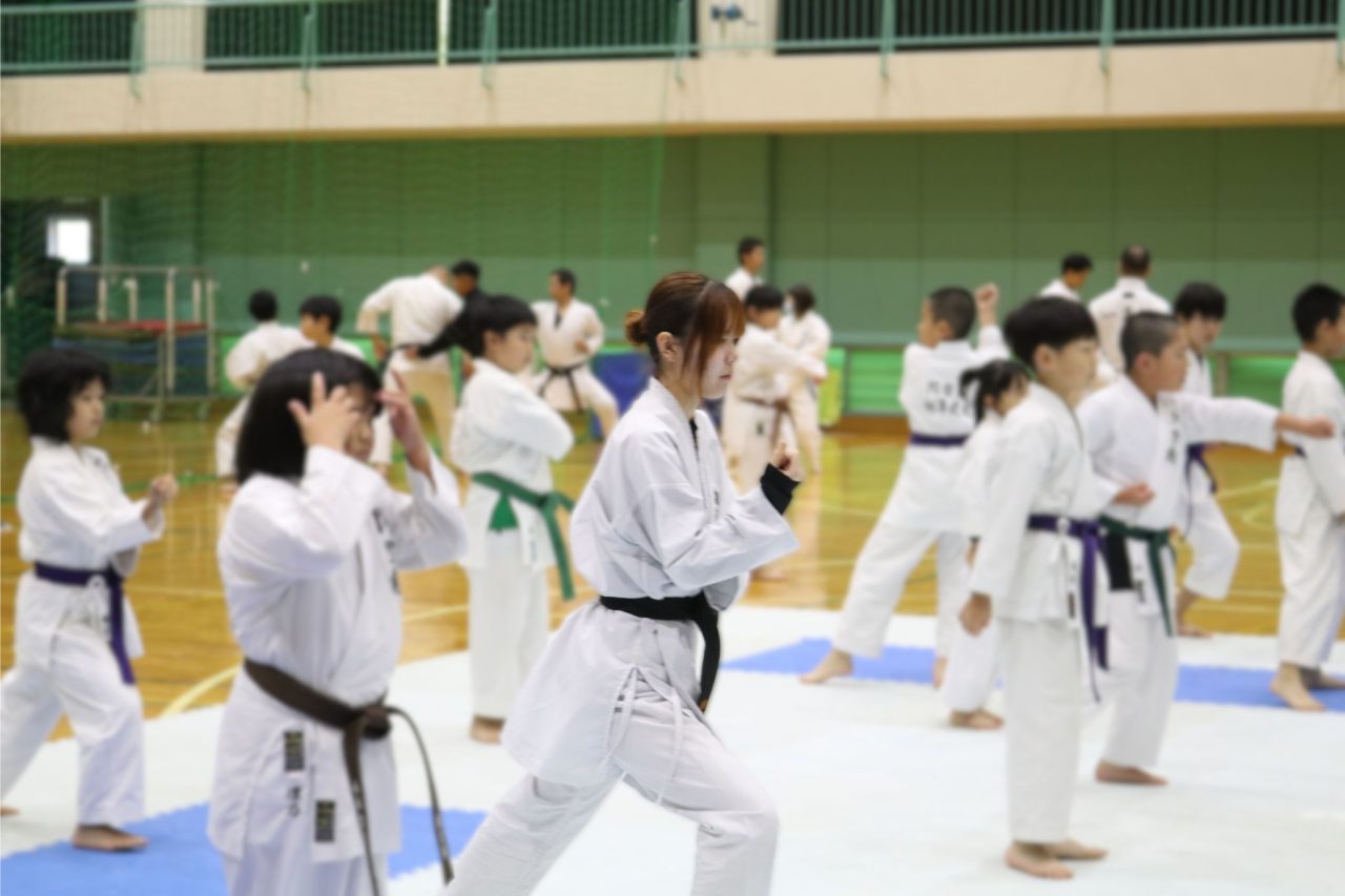 当日は、60人ほどの子どもたちや保護者、空手の関係者約100人に来校してもらい、午前は形、午後は組手の稽古といったスケジュールで、基礎から応用まで充実した講習会となりました。