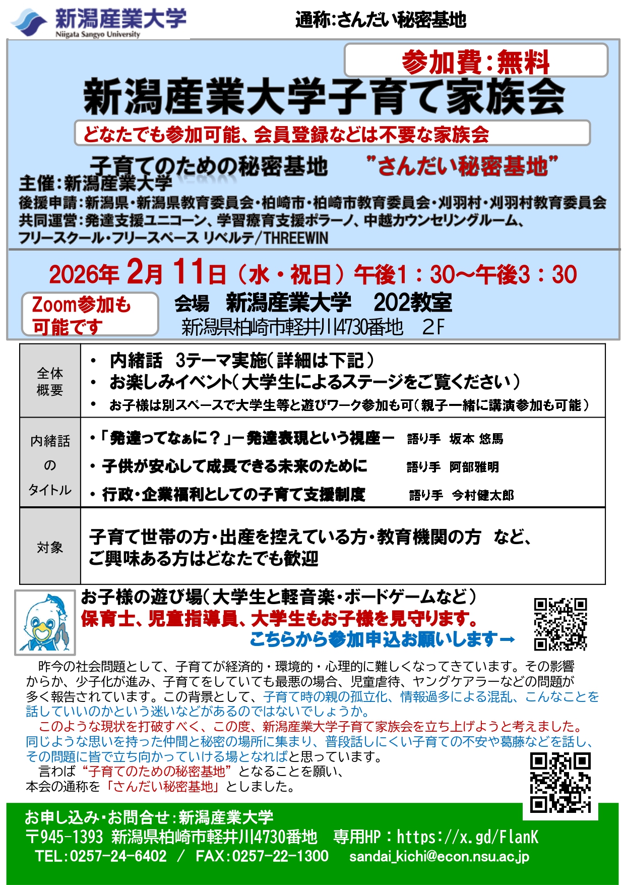 2/11(水・祝日)に本学で子育てに関するイベント「さんだい秘密基地」を開催します。